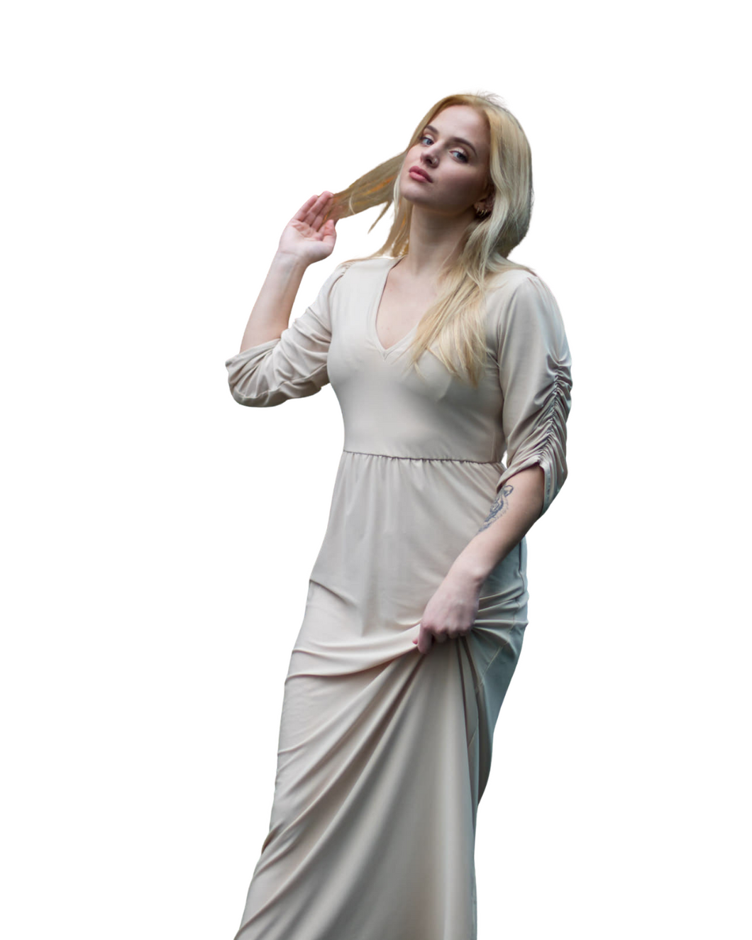 - Djúpt V-hálsmál, pils rykkt í mittið og ermar rykktar.